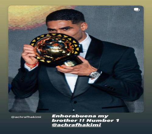拉莫斯在社交媒体上晒出了阿什拉夫亲吻非洲足球先生奖杯的照片,同时配文写道:“祝贺我的兄弟!你是No.1!”