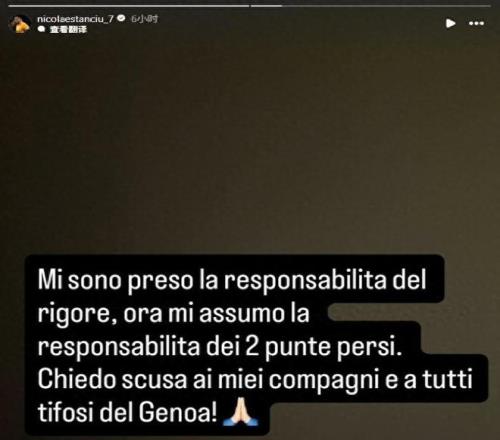 斯坦丘自从去年加盟热那亚以来,在各项赛事中第7次出场,此前斯坦丘曾在意大利杯的比赛里打进一球。但在意甲联赛,斯坦丘一直没有斩获进球。这个点球罚丢,他遭受了网暴,赛后他在社媒发文道歉:“我承担了点球的责任,承担丢掉这2分的责任。我向队友和所有热那亚球迷道歉。”